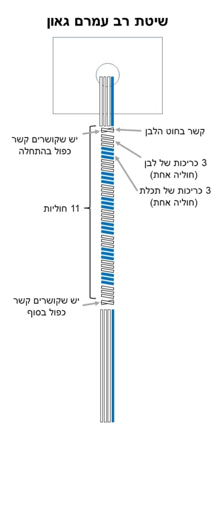 “כך היה גודל לאחר קשר התחתון חוליה אחת של לבן ועליה של תכלת וחוליה של לבן ועליה חוליה של תכלת ועליה חוליה של לבן ועליה של תכלת ועליה של לבן וקושר קשר העליון וזה הוא לא יפחות משבע ואם רצה להוסיף עד י”ג מוסיף כסדר הזה.”