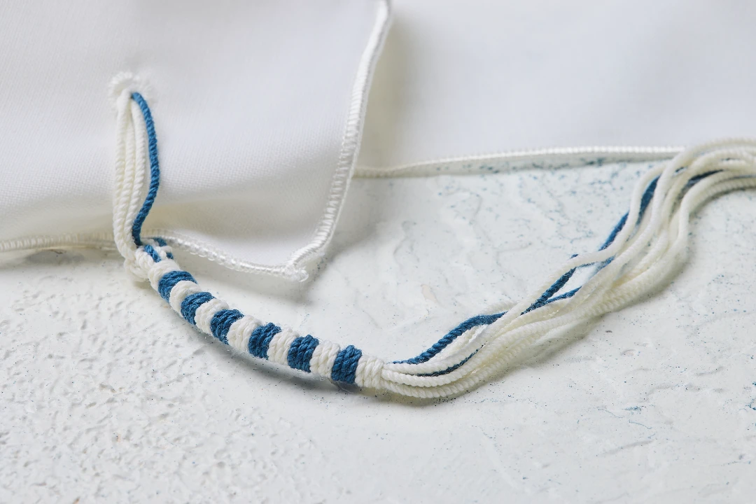 1. “קשר יחיד” יוצרים באופן הבא: כורכים פתיל לבן אחד סביב שבעת הפתילים הנותרים, ולאחר מכן תוחבים את קצהו לתוך הכריכה ומהדקים.