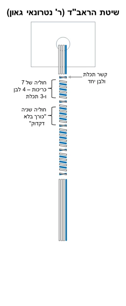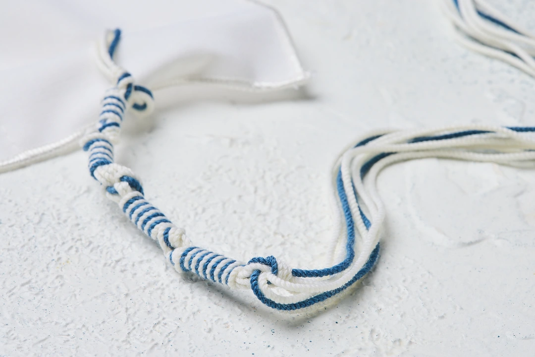 - בסוף כל חולייה יוצרים “קשר חוט תכלת-לבן יחיד” באופן הבא: יש לכרוך פתיל לבן אחד ופתיל תכלת יחד סביב ששת הפתילים הנותרים ולאחר מכן לתחוב את קצות הפתילים הללו לתוך הלולאה שנוצרה ולהדק.