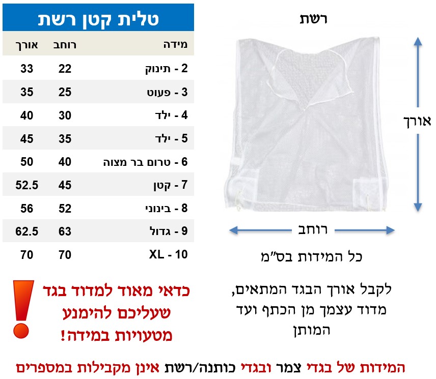 בגד רשת פוליאסטר קל. עוקב אחר רובו (רוחב הבד עולה על פתח הראש, כנדרש בהלכה). לא מוצא את מה שאתה רוצה? לחץ כאן להרכיב טלית קטן לפי רצונך